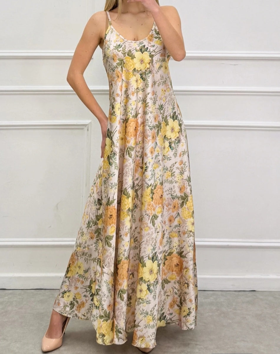 LÅNG KLÄNNING SATIN, BLOMMIG Gul