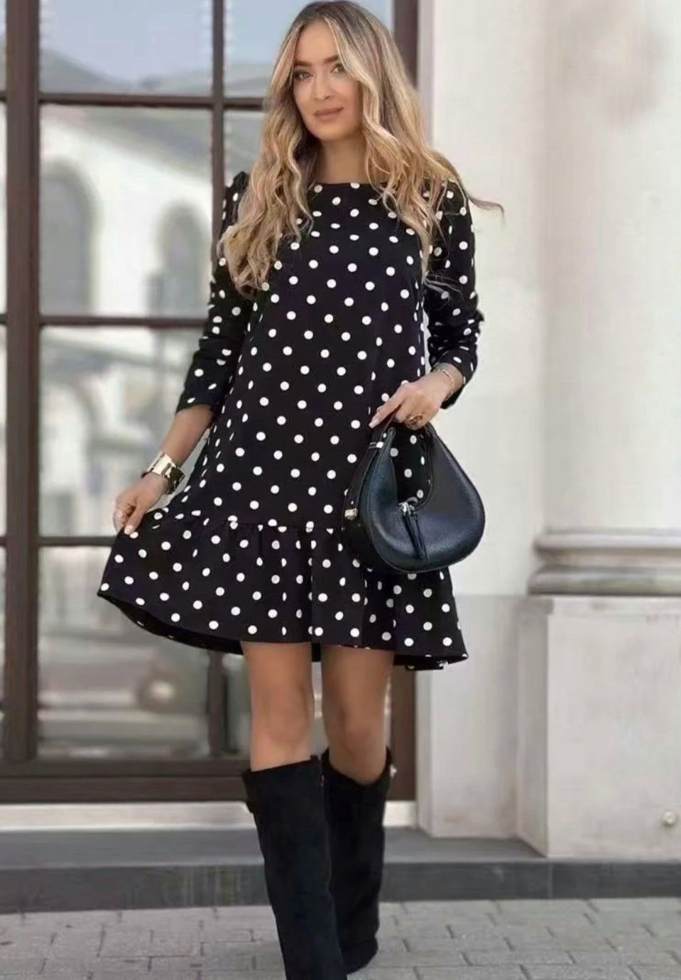 Långärmad prickig klänning Svart