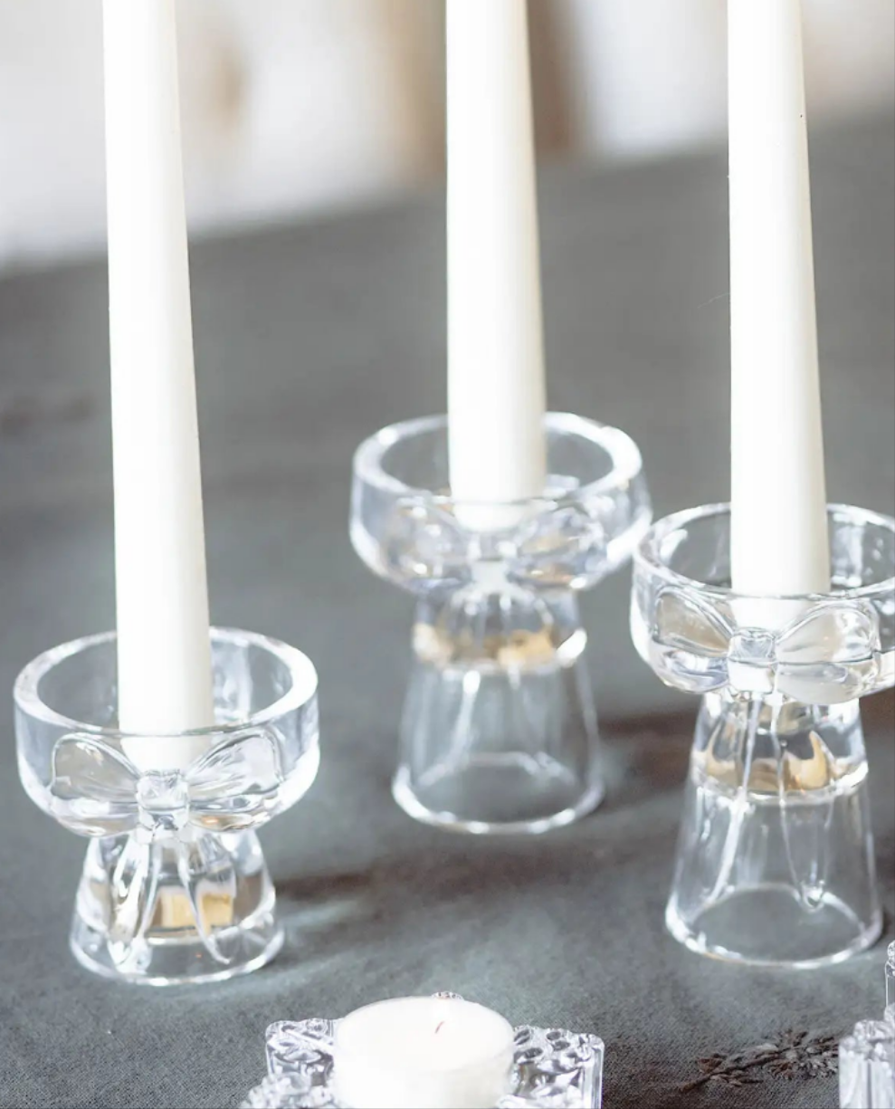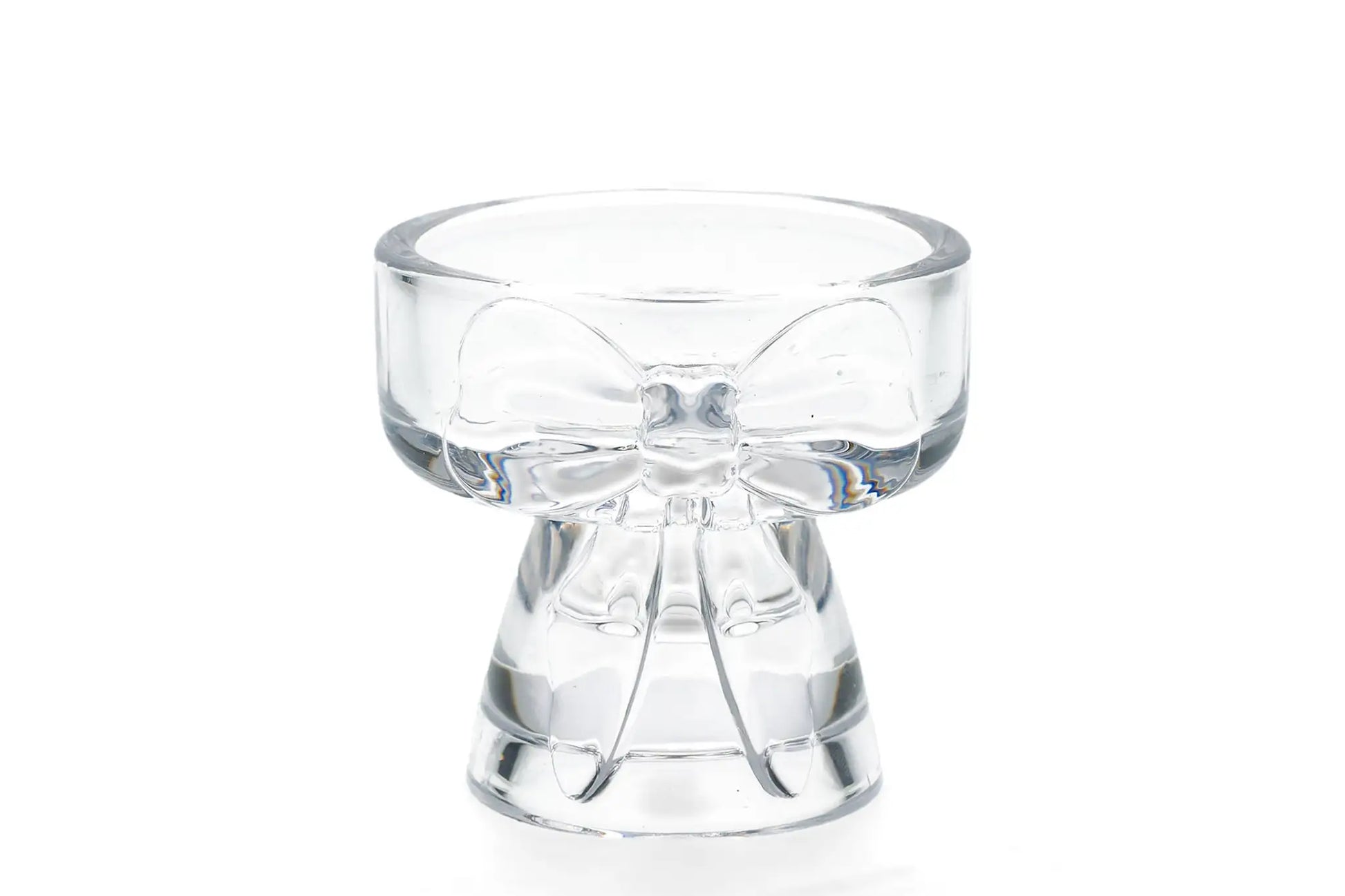 Lys upp rummet med levande ljus med denna ljusstake med rosett. Passar både kronljus och värmeljus. Tillverkad i glas. Finns i flera storlekar.