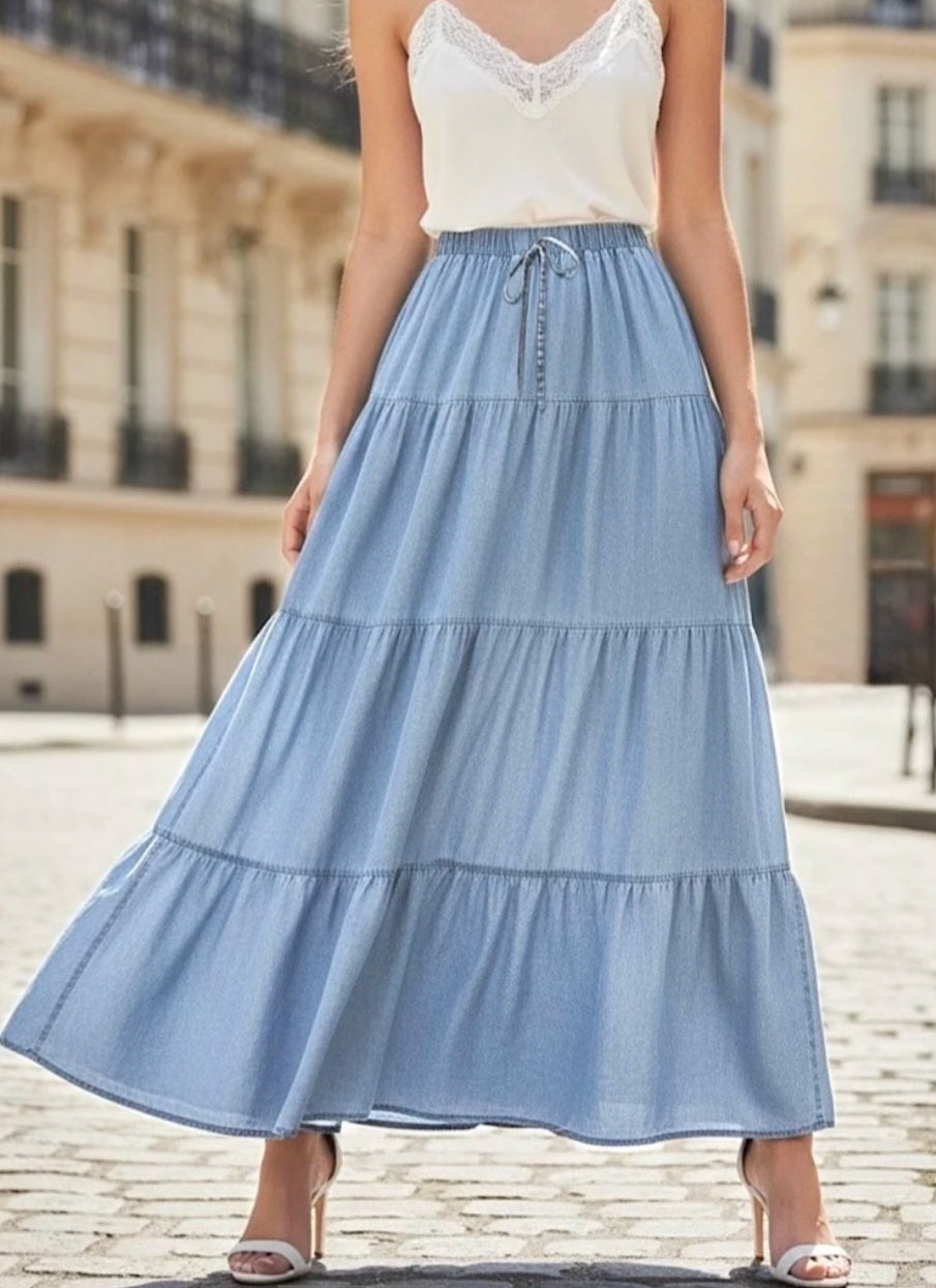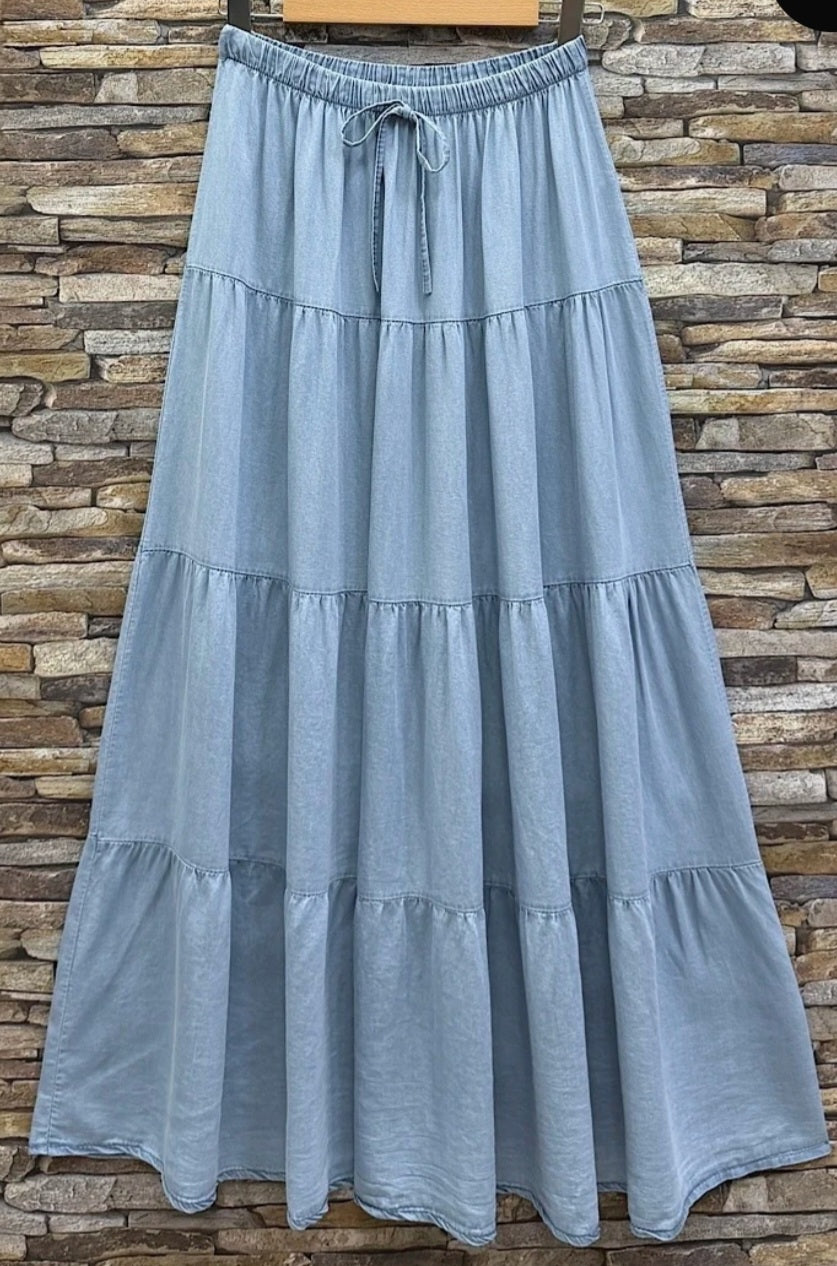 ALEXA kjol med böljande, volangdesign i denim och resår i midjan av LYOCELLMATERIAL.