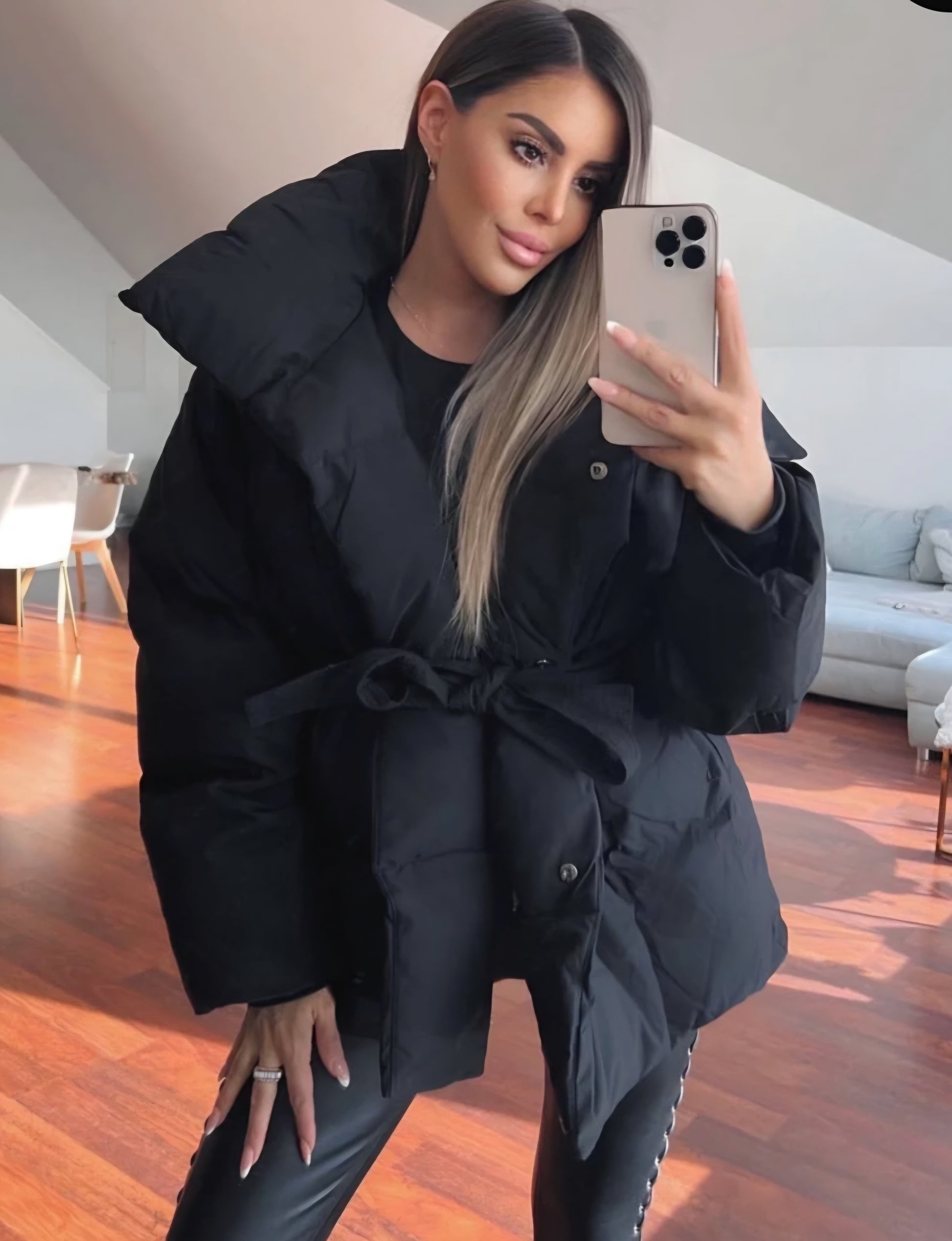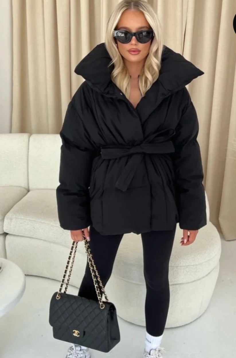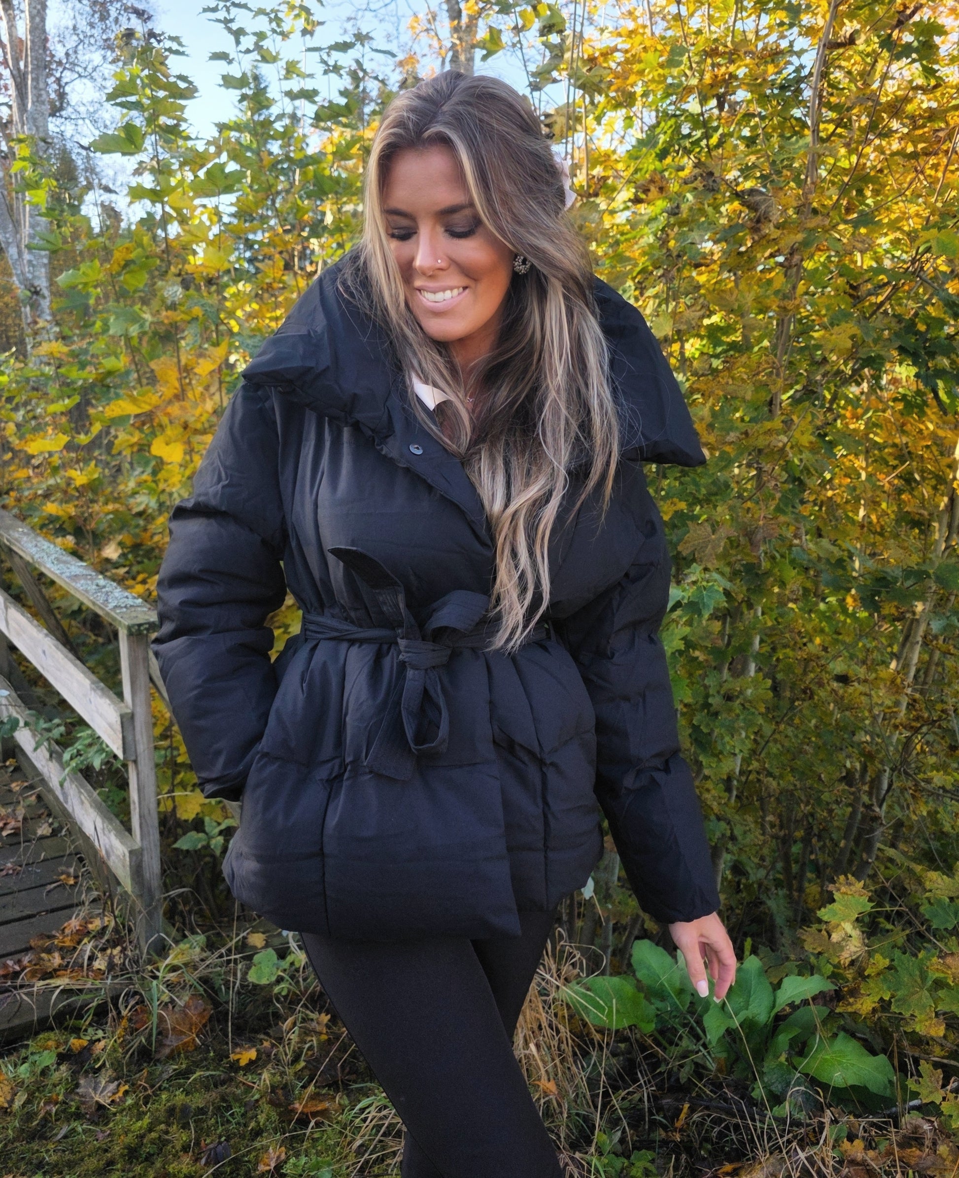 Quiltad dunjacka i tyg med stor krage med slag. Långa ärmar med nedsänkta ärmhål. Ribbade muddar. Slim fit. Dold tryckknappsknäppning. Avtagbart knytbälte med ribbstickad söm. Fickor med dragkedjor dolda under sidsömmarna. Fodrad inuti. Modellen är 176 cm lång och bär storlek S/M.