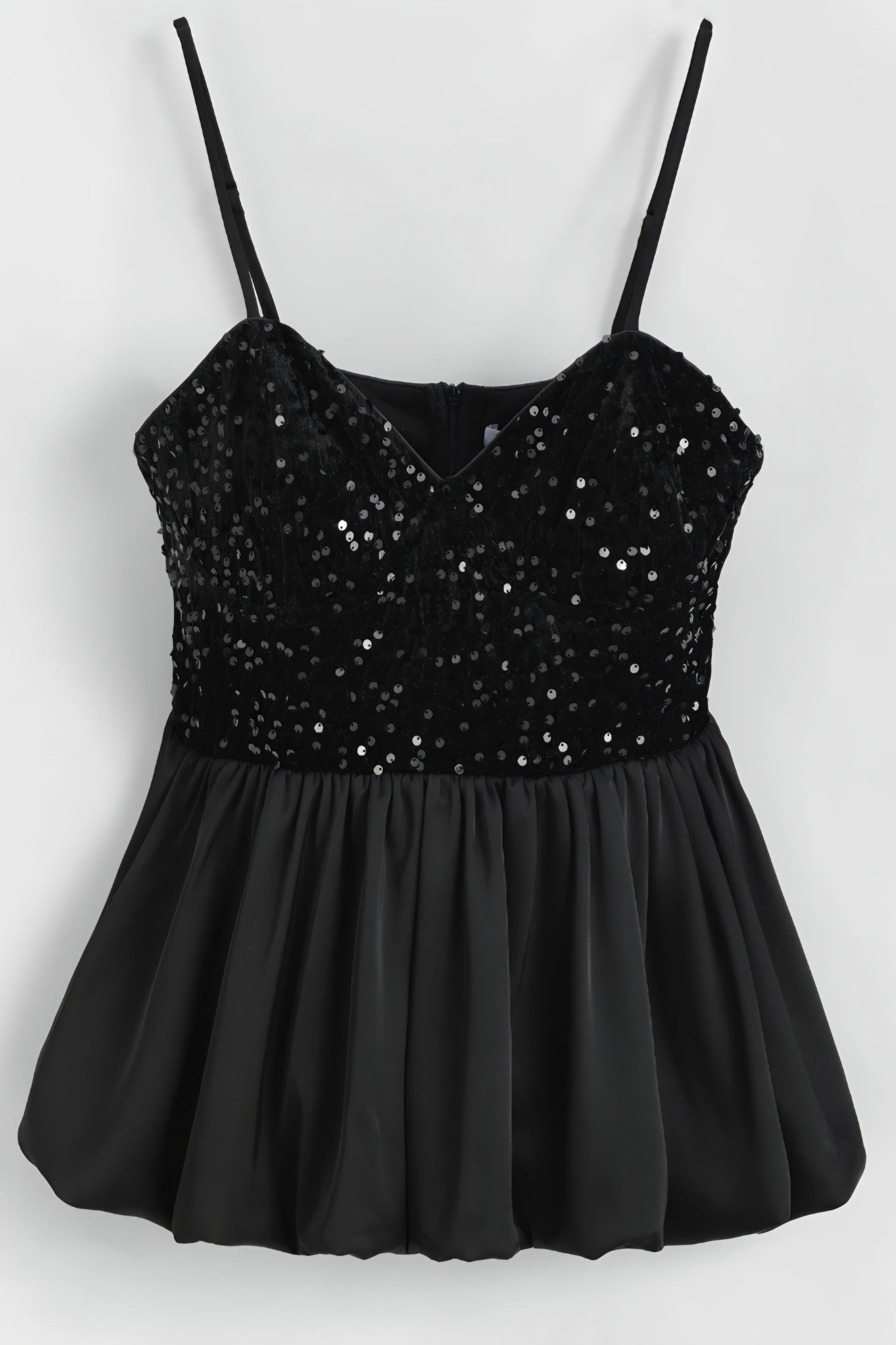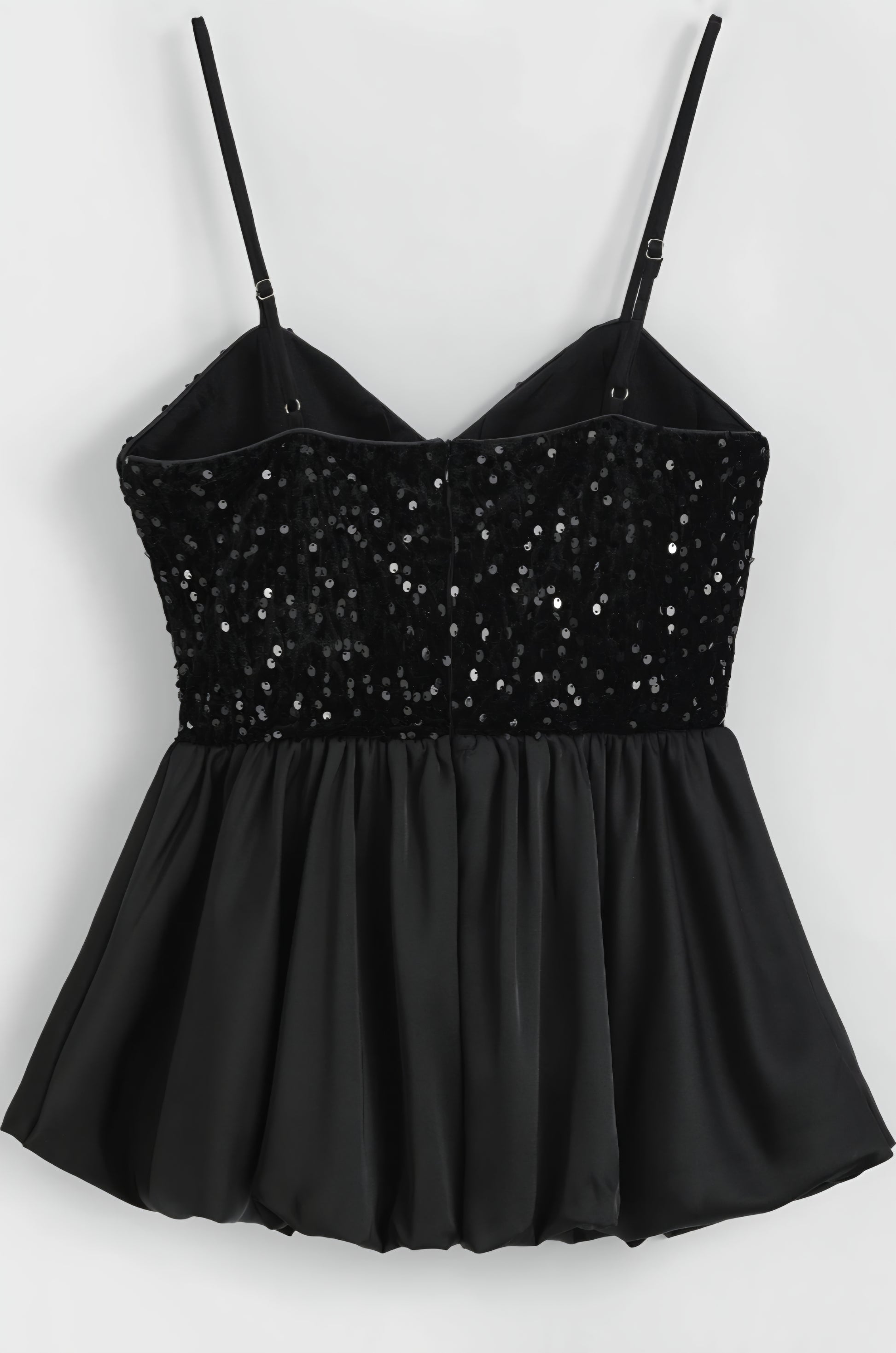 Justerbar topp med band. Sammetstopp klädd med paljetter. Hjärtformad halsringning med prinsesssnitt. Peplum i satinkant. Dold dragkedja bak.