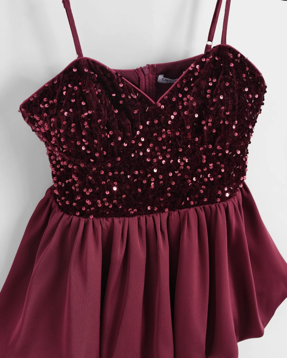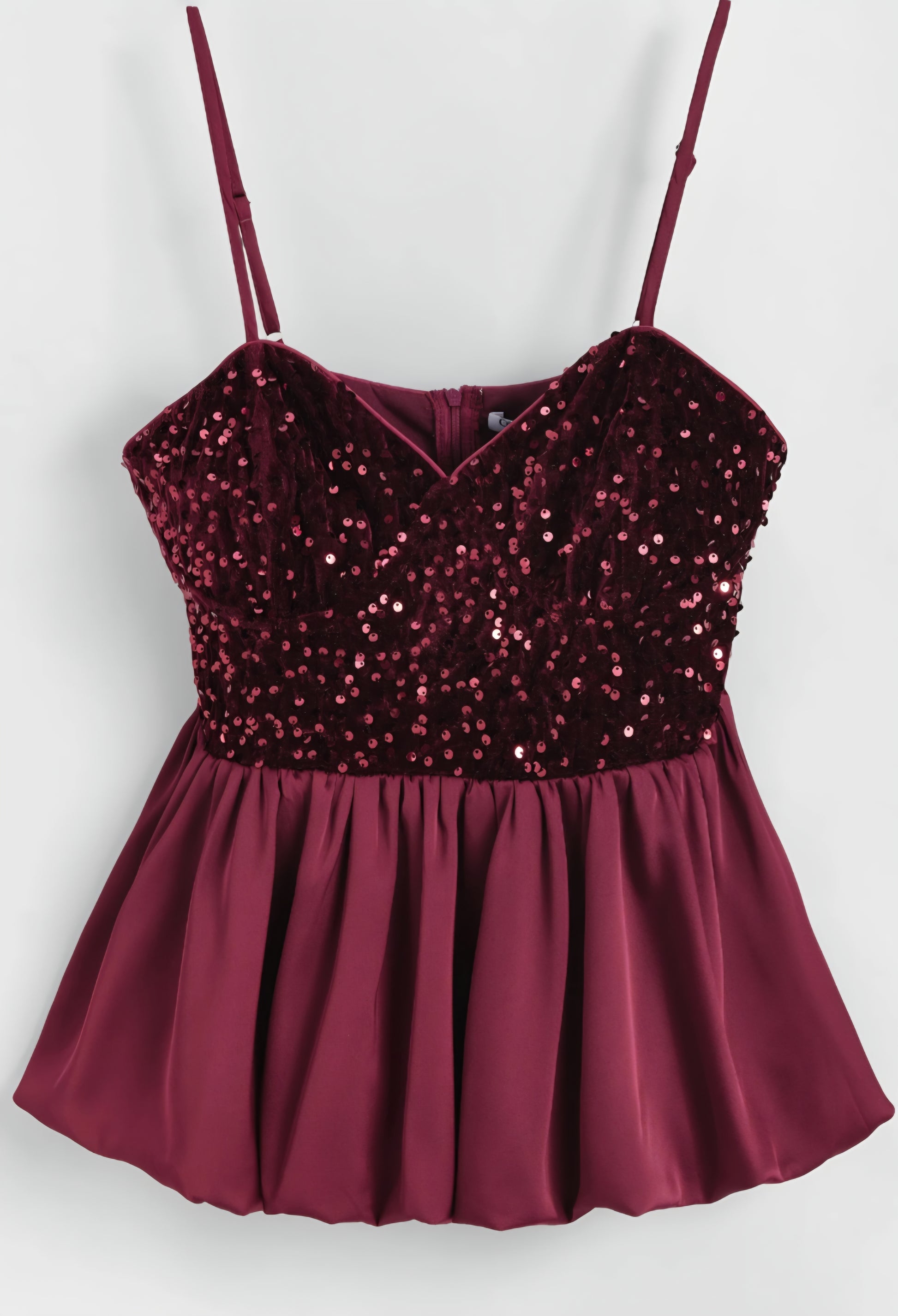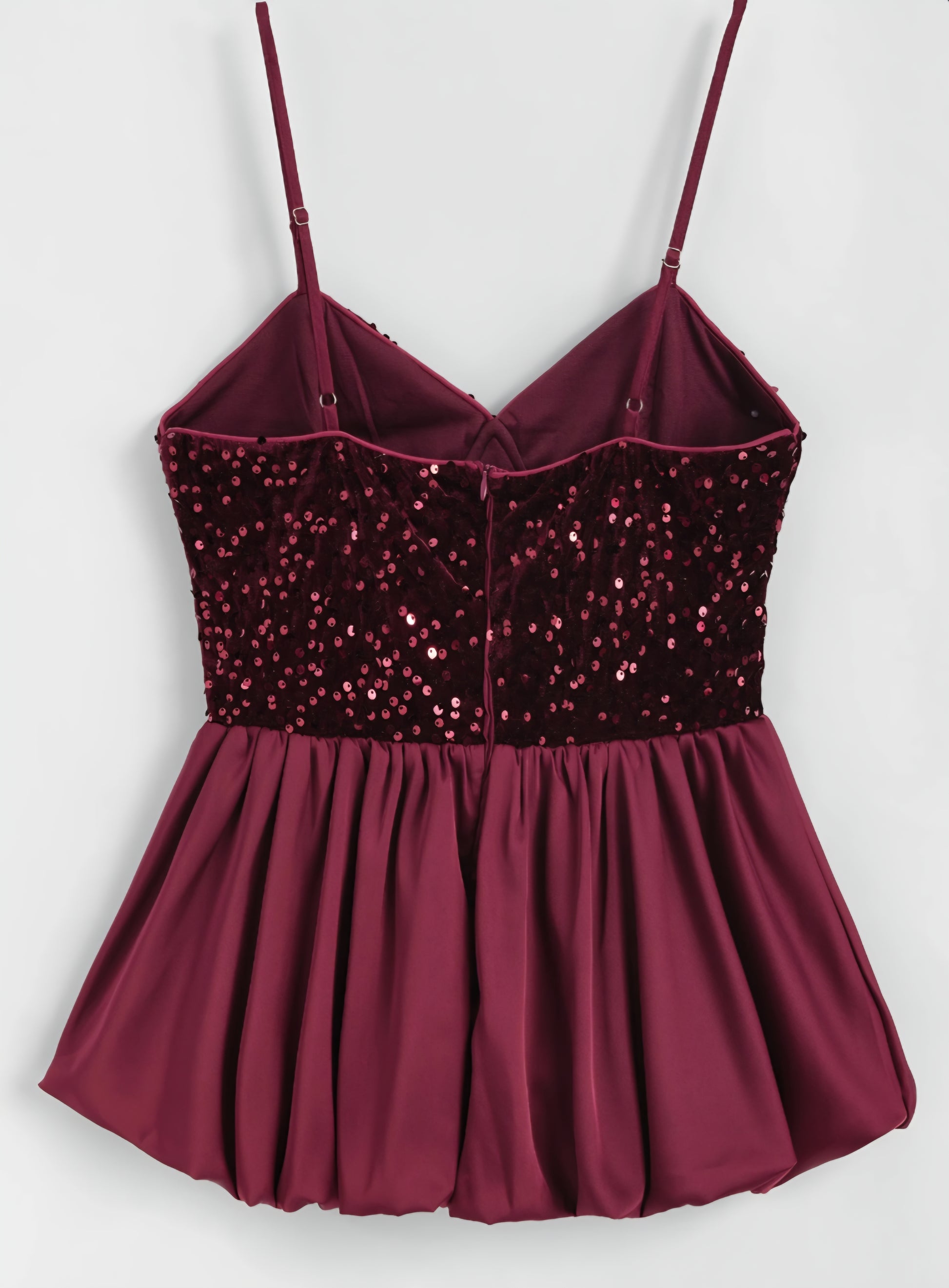Justerbar topp med band. Sammetstopp klädd med paljetter. Hjärtformad halsringning med prinsesssnitt. Peplum i satinkant. Dold dragkedja bak.