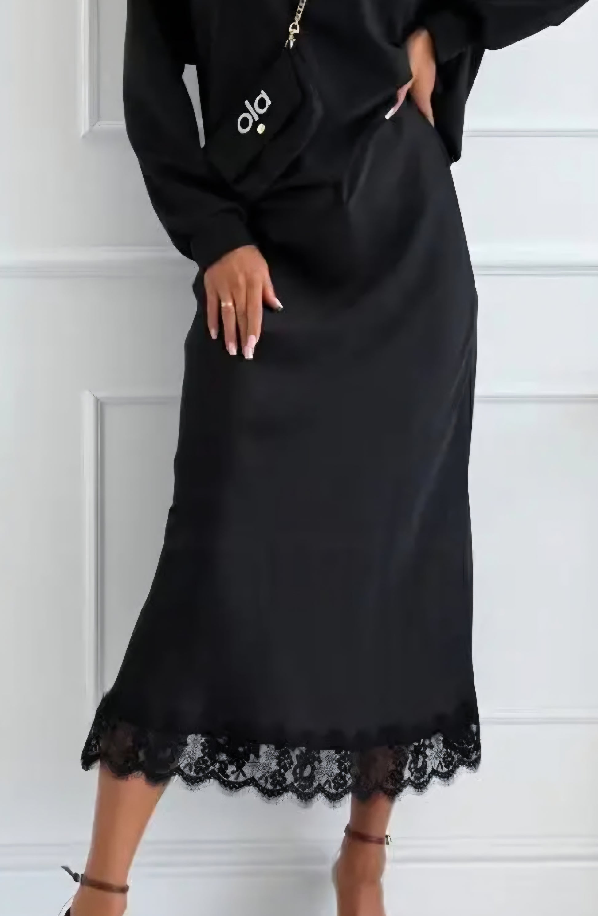 Lång satinkjol med resår i midjan, finns i tre storlekar: S, M, L.