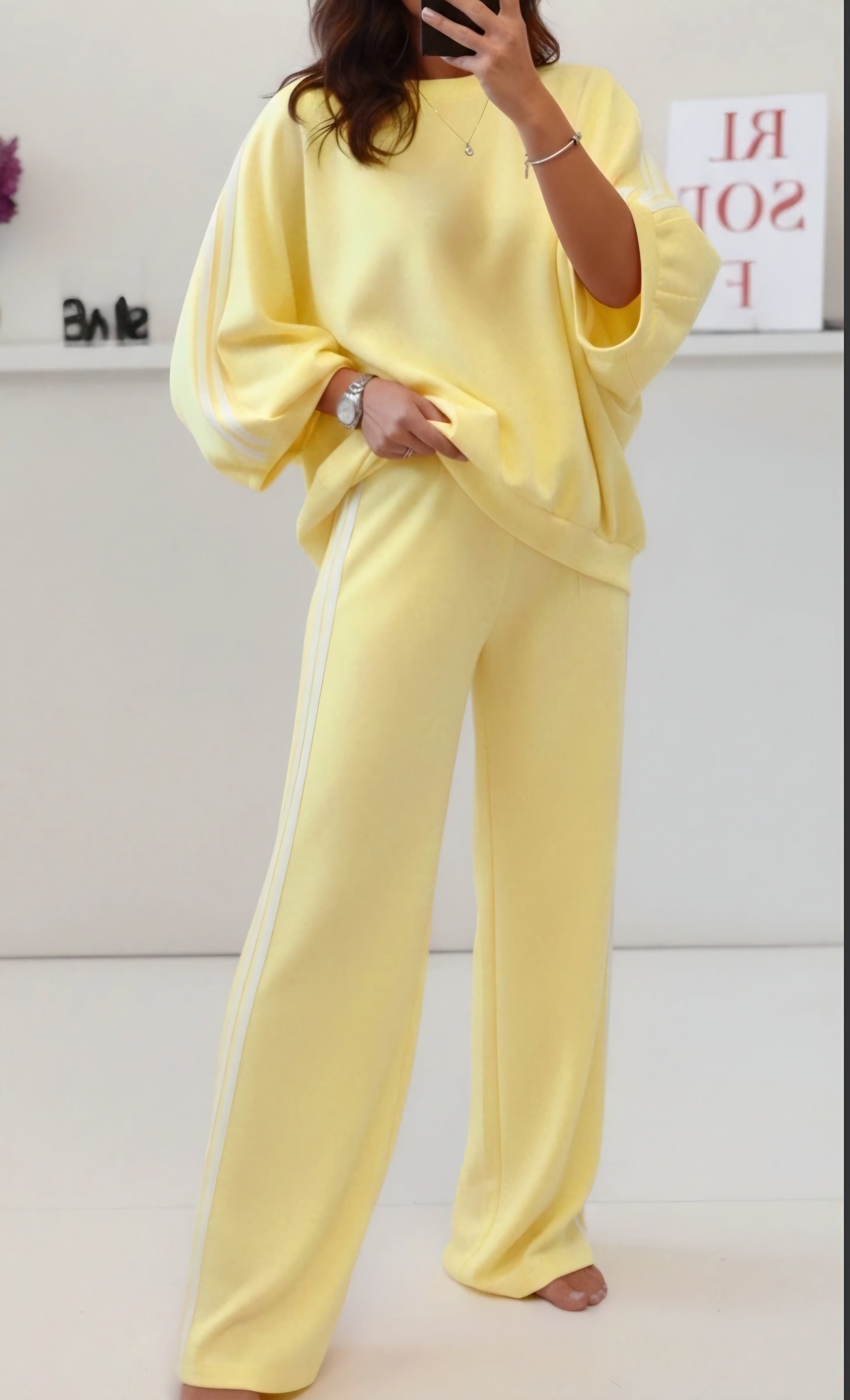 Sweatshirten har en lös passform med trekvartsärm och sportigt eleganta detaljer, medan de mycket aktuella byxorna med vida ben har en resår i midjan för optimal komfort och vertikala vita ränder som förlänger silhuetten.