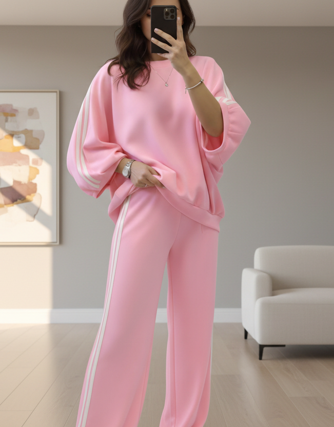 Sweatshirten har en lös passform med trekvartsärm och sportigt eleganta detaljer, medan de mycket aktuella byxorna med vida ben har en resår i midjan för optimal komfort och vertikala vita ränder som förlänger silhuetten.