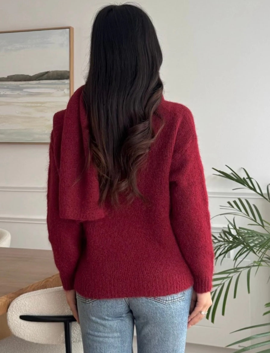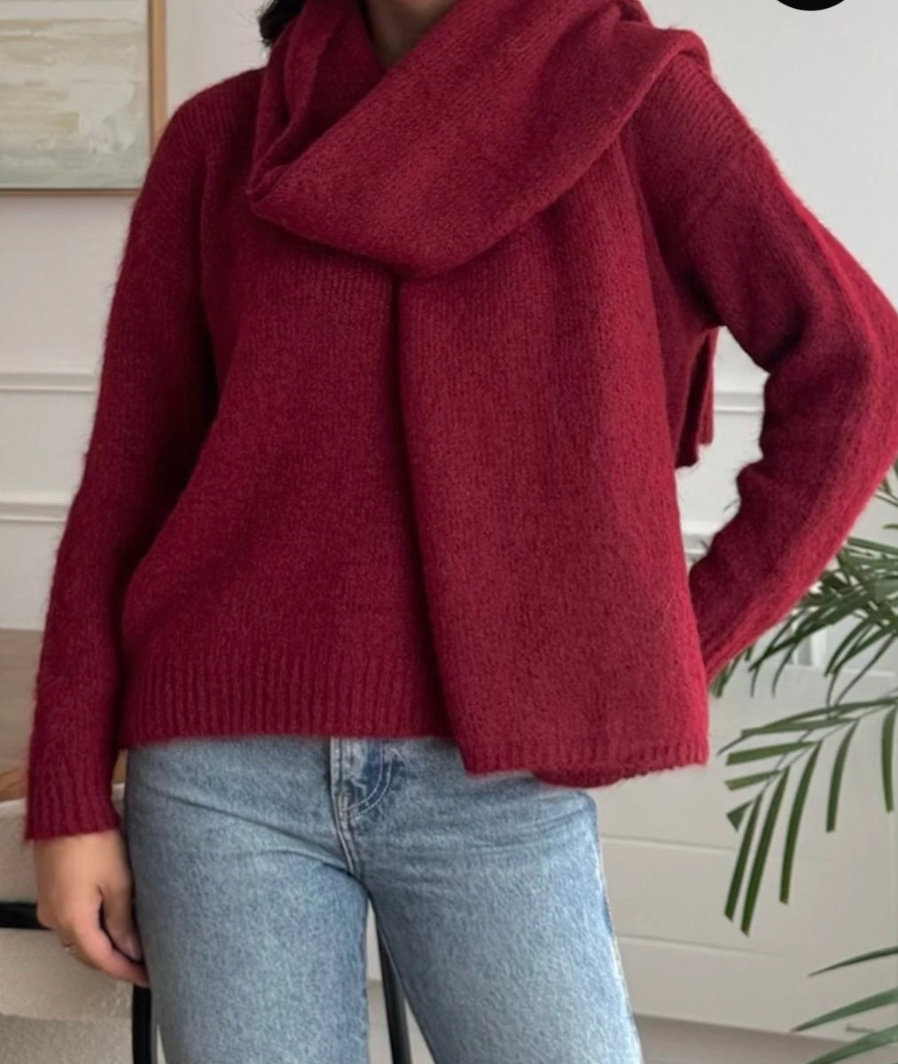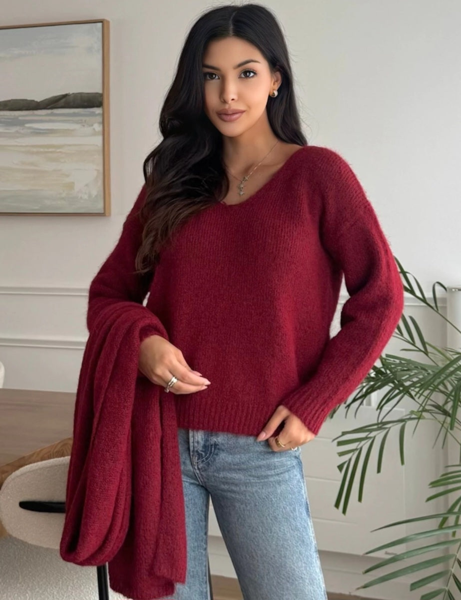 Mysigt och trendigt set: mjuk V-ringad tröja med avslappnad passform, kombinerad med matchande halsduk. Perfekt för en elegant och bekväm vardagslook.