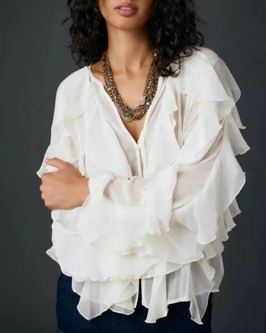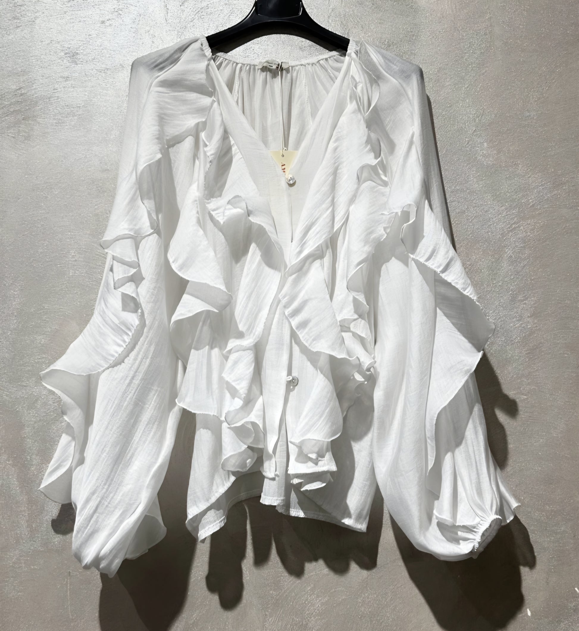 Denna voluminösa blus i lyocell har en charmig rynkad effekt. Den ståtar med vida långa ärmar och en elegant krage. Perfekt för en elegant men ändå avslappnad look, detta plagg ger en touch av sofistikering till vilken outfit som helst. OS= 36-42 Amy&Clo Paris
