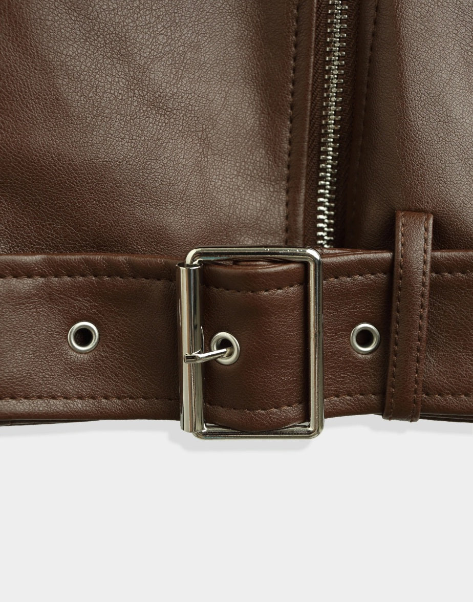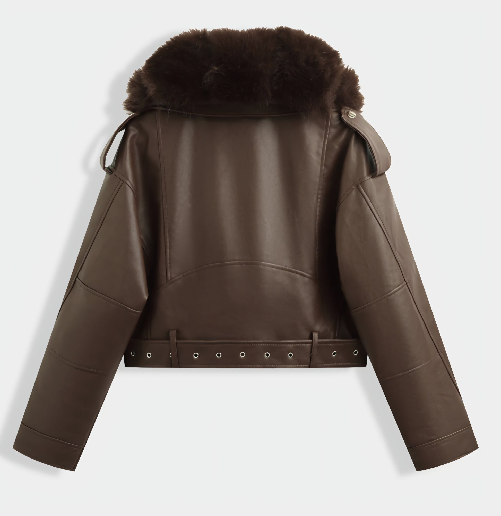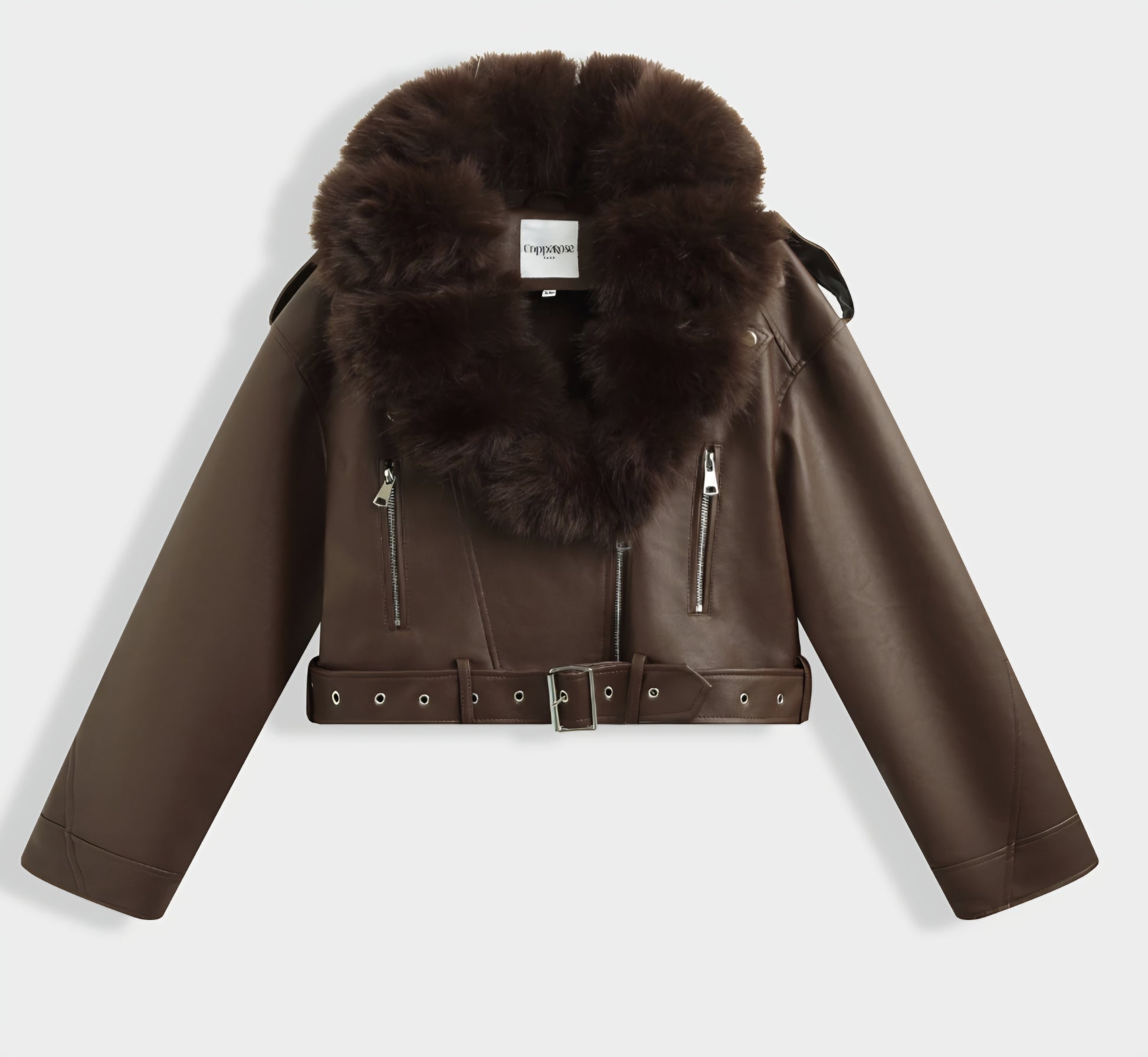 Kort jacka med överdimensionerad, avtagbar krage i fuskpäls. Metallisk dragkedja fram. Knäppta axelflikar, vertikala fickor med dragkedja och justerbart spännesbälte nedtill. Foder i samma färgton.