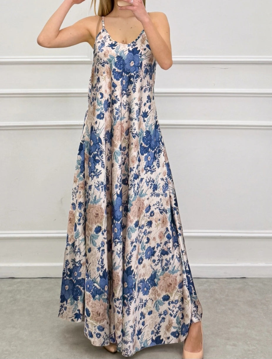 Lång klänning i satintyg med en silkeslen känsla, med ett elegant blommigt tryck. Den böljande designen med tunna axelband och V-ringning faller mjukt över silhuetten.