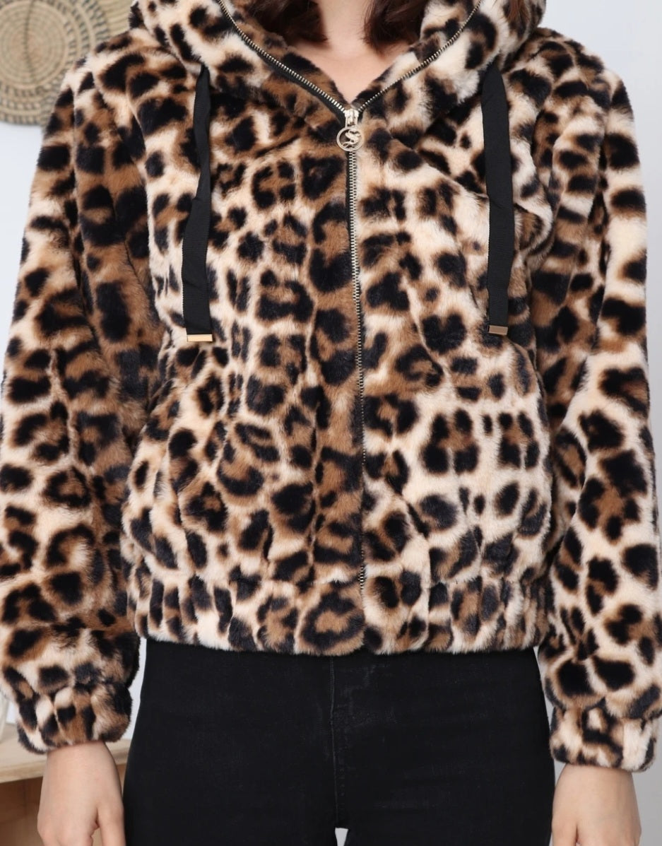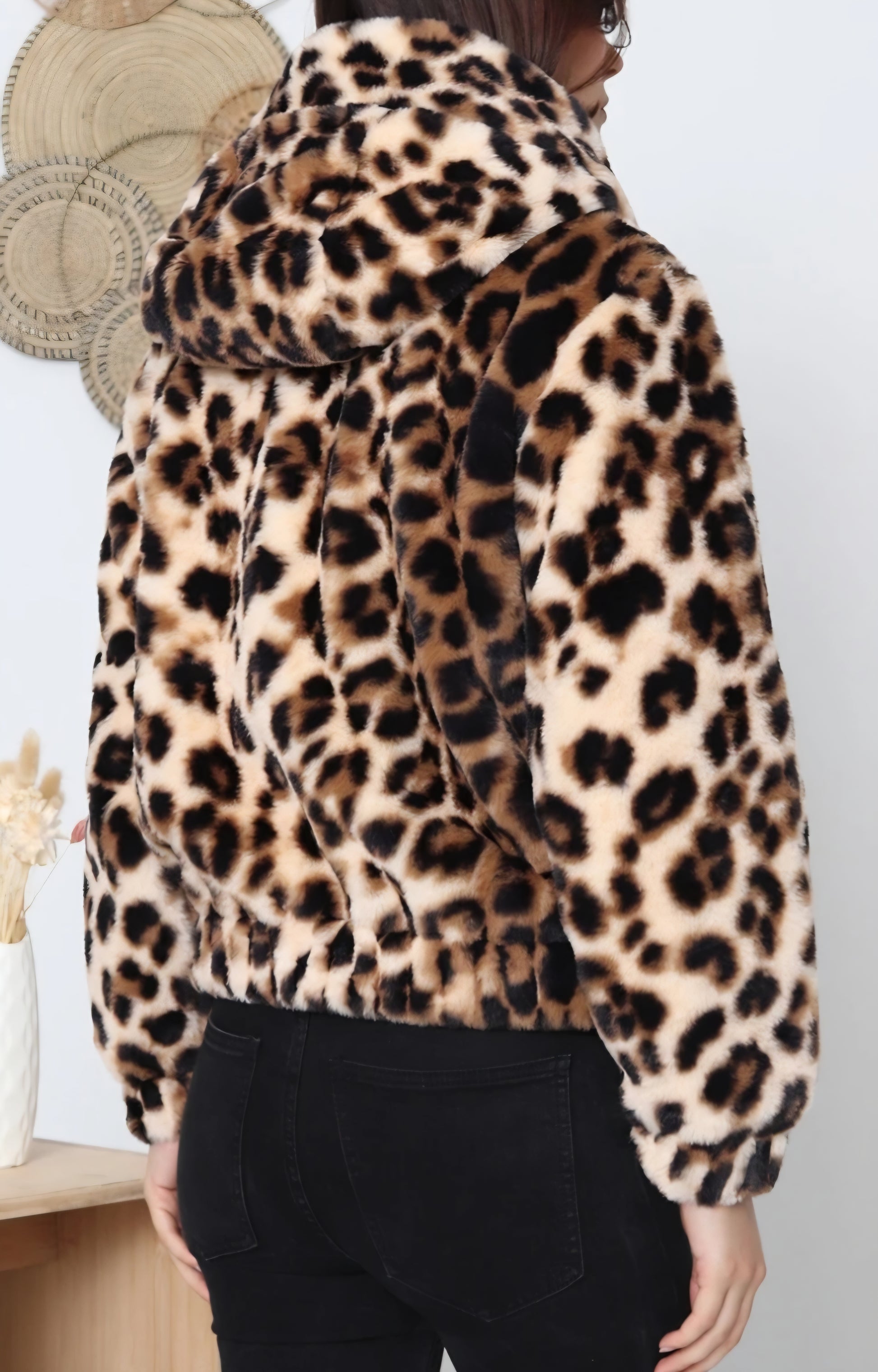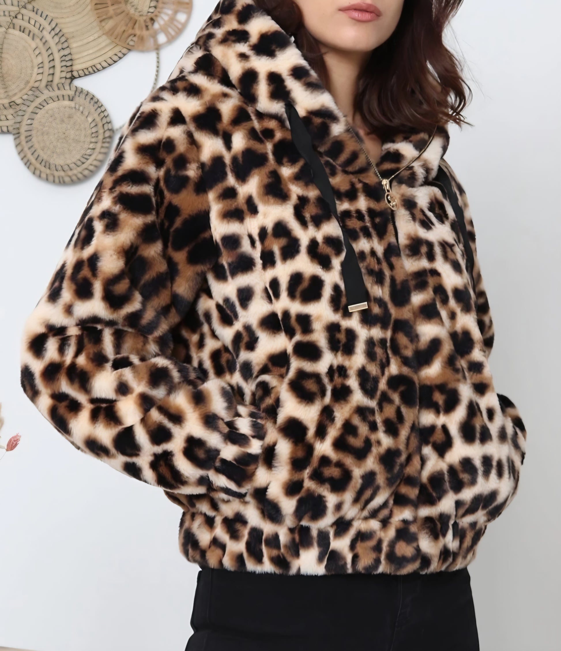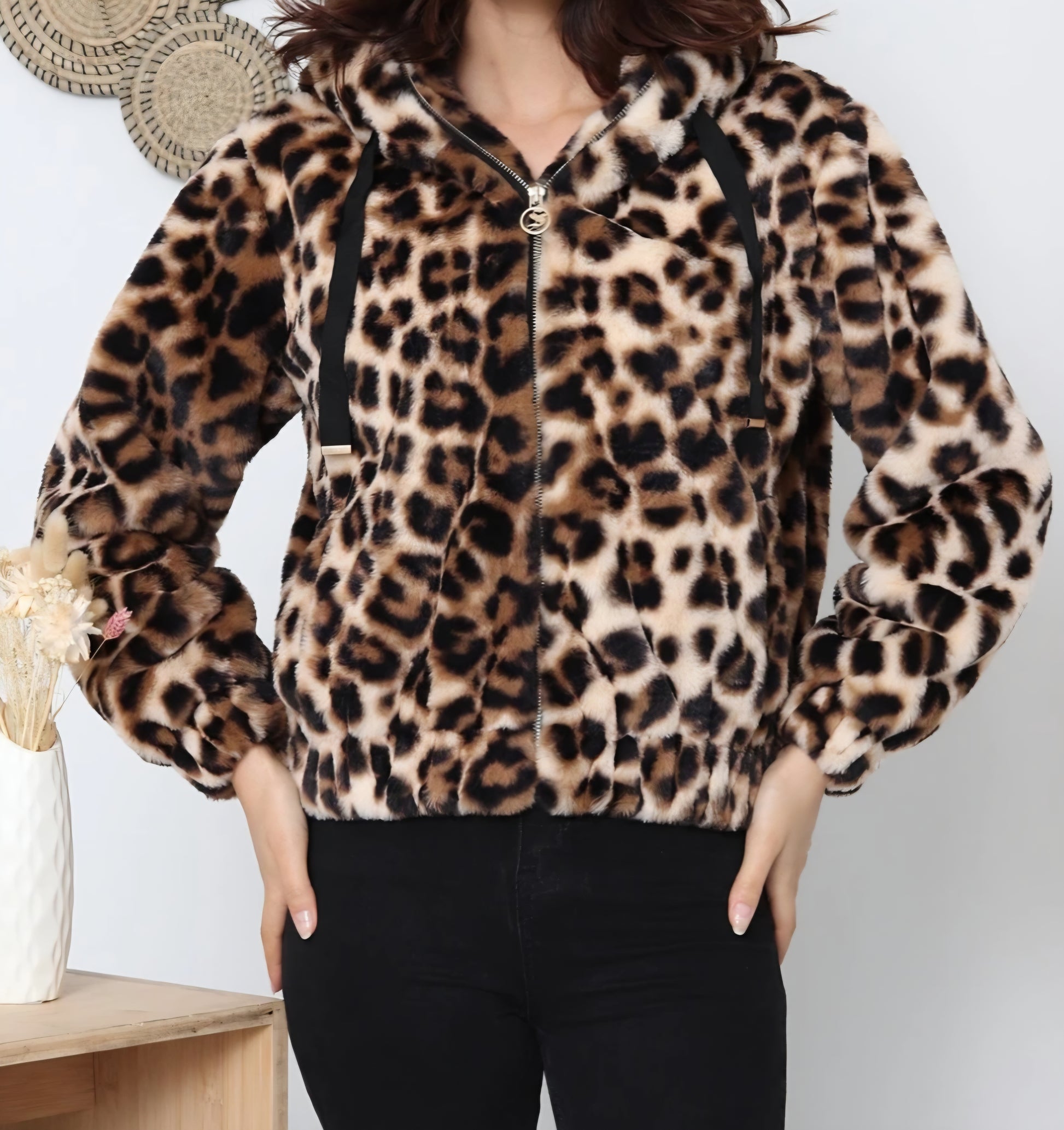 Jacka i fuskpäls med huva och resår i nederkant och ärmslut. Fickor.