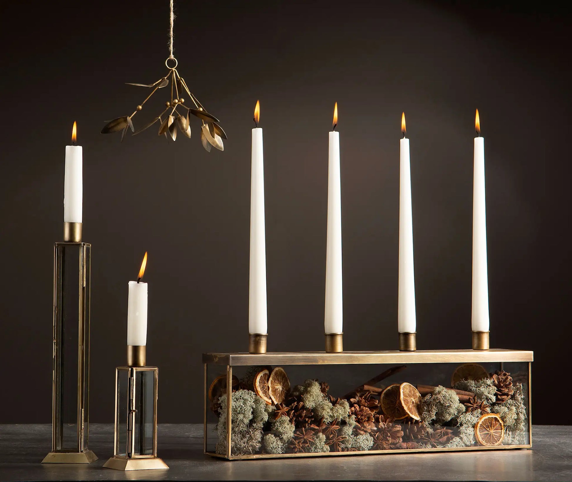 Ljusstake med plats för fyra ljus. Fyll glaslådan med mossa, kottar, apelskinskivor eller liknande för att få en fin adventsljusstake. Tillverkad i glas och metall.