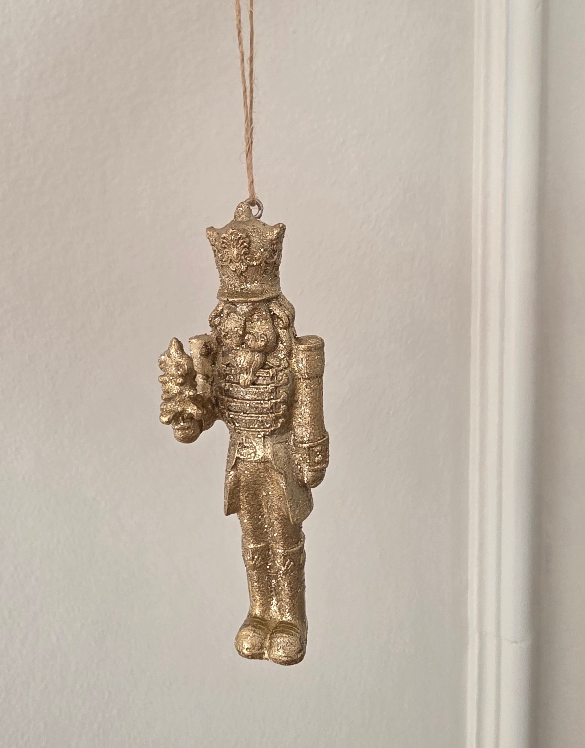 Denna charmiga nötknäpparprydnad ger en festlig touch med sin klassiska design och skimrande ljusguldfinish. Tillverkad av polyresin med invecklade detaljer, utstrålar den vintage-elegans medan den hänger från en rustik snörögla. Perfekt för att dekorera din julgran, ger denna prydnad en tidlös och magisk charm till säsongsbetonad inredning.
