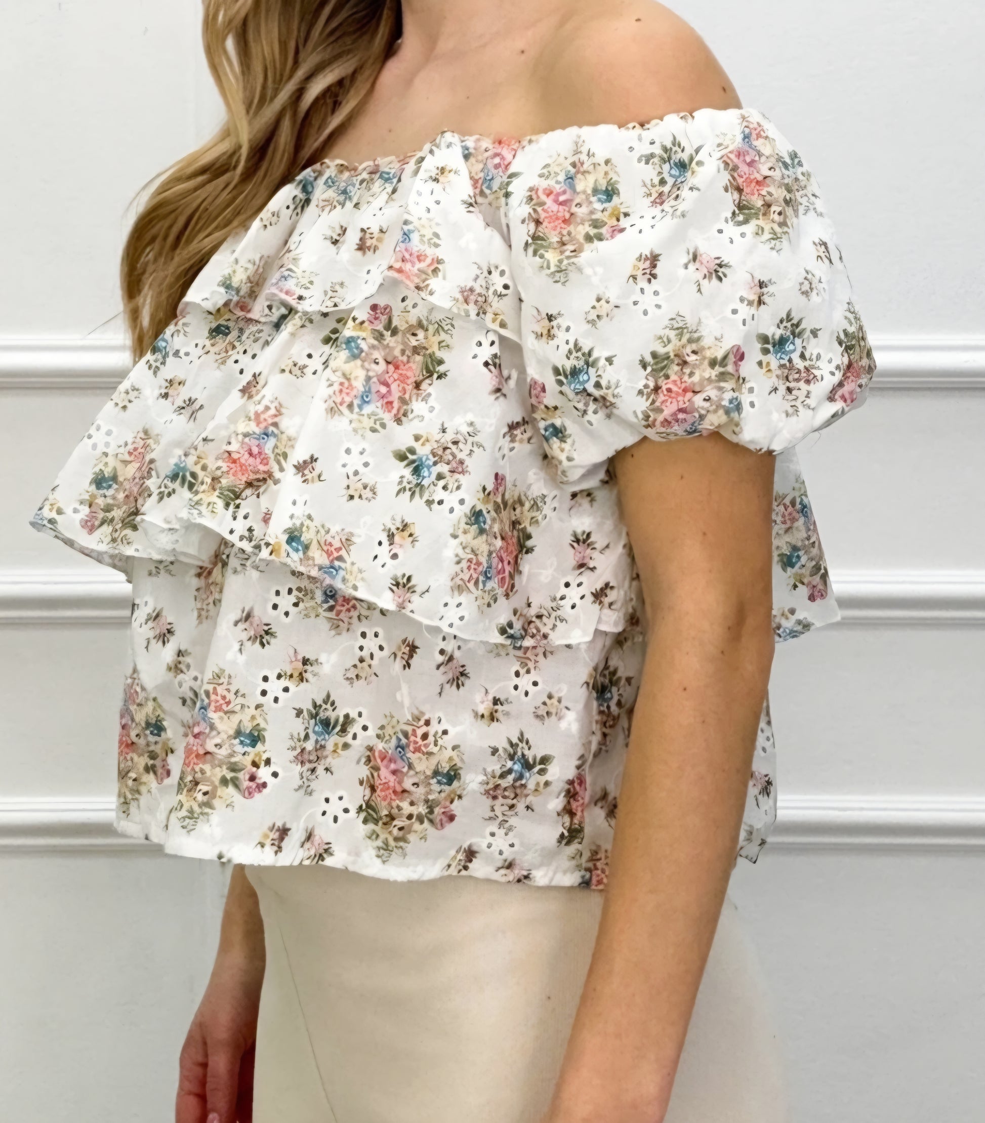 Topp i broderi anglaise med ett fint vintageblommönster och stora, kaskadliknande volanger. Resår i båtringning, puffärmar och broderi anglaise-detaljer.