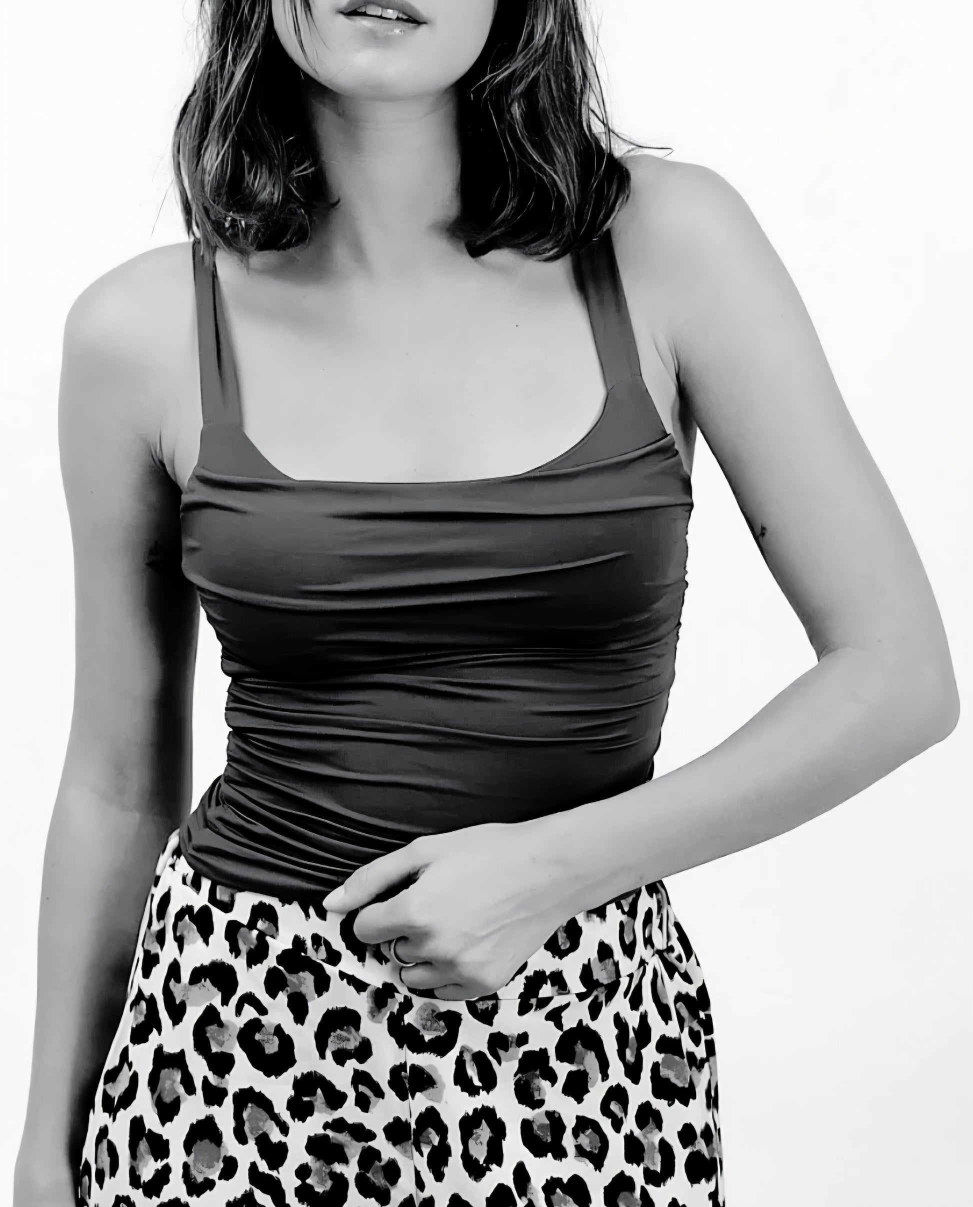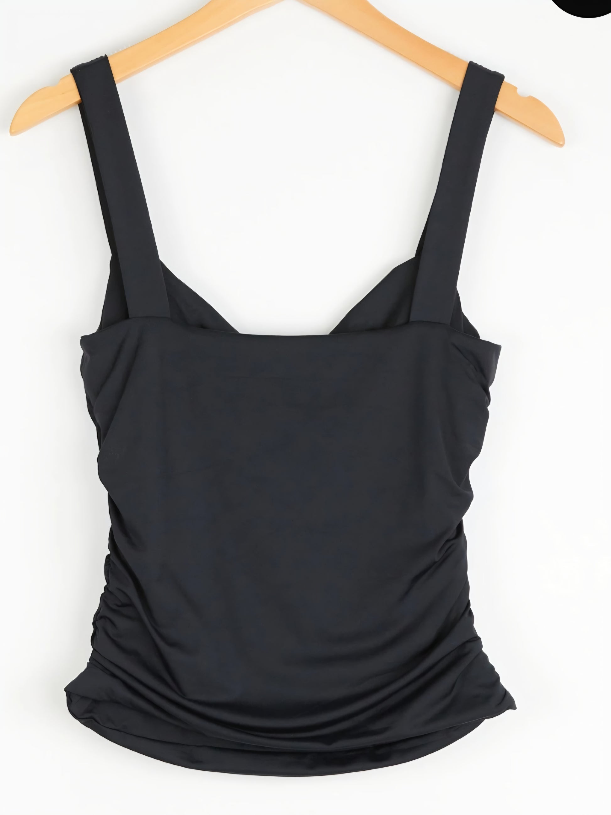 Figurnära topp i modern stil med breda axelband och fyrkantig halsringning. Det rynkade stretchtyget längs hela längden framhäver silhuetten samtidigt som det ger komfort och stöd. Perfekt att bära med jeans för en elegant avslappnad look eller med en kjol för en mer uppklädd stil.