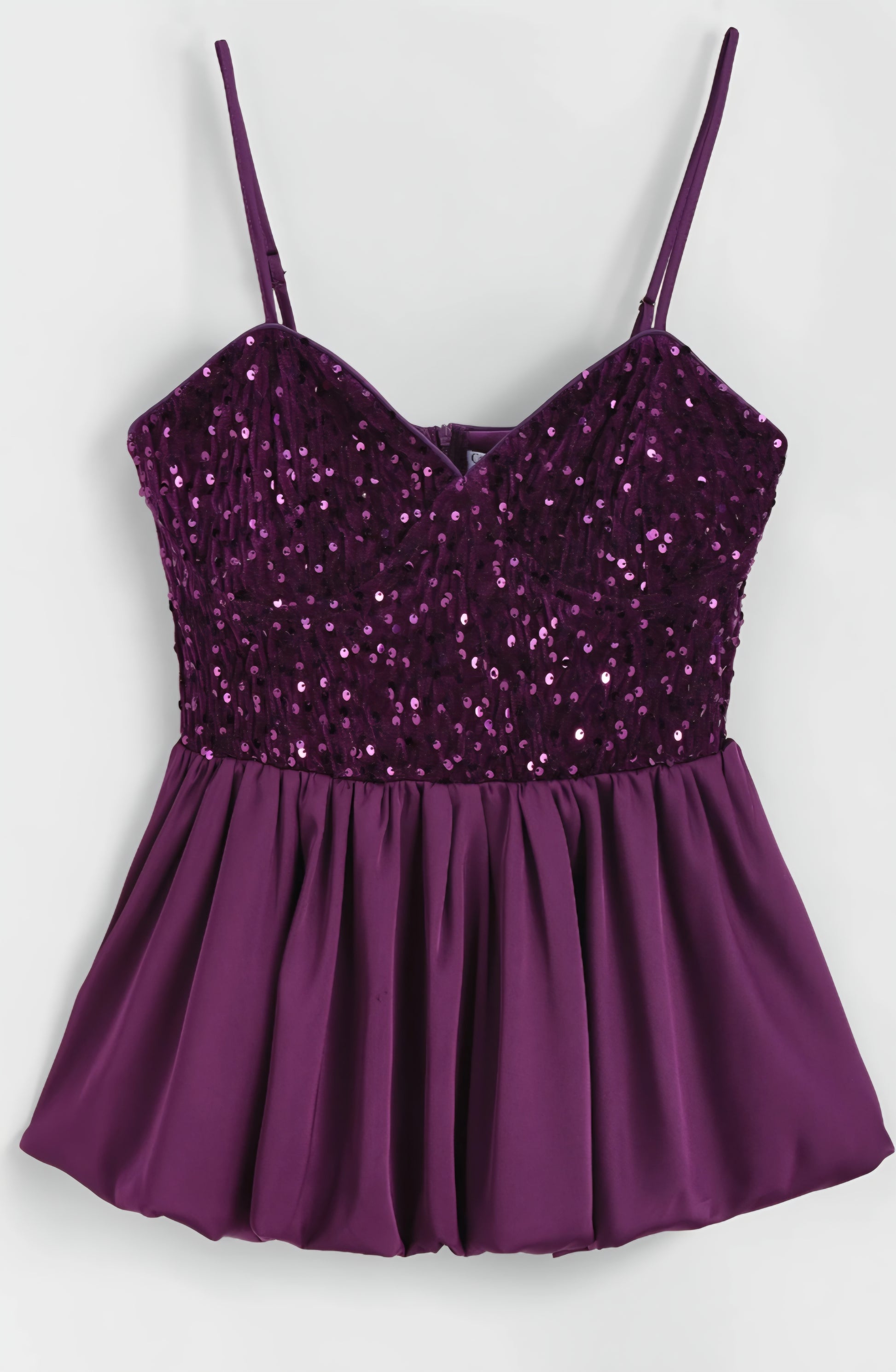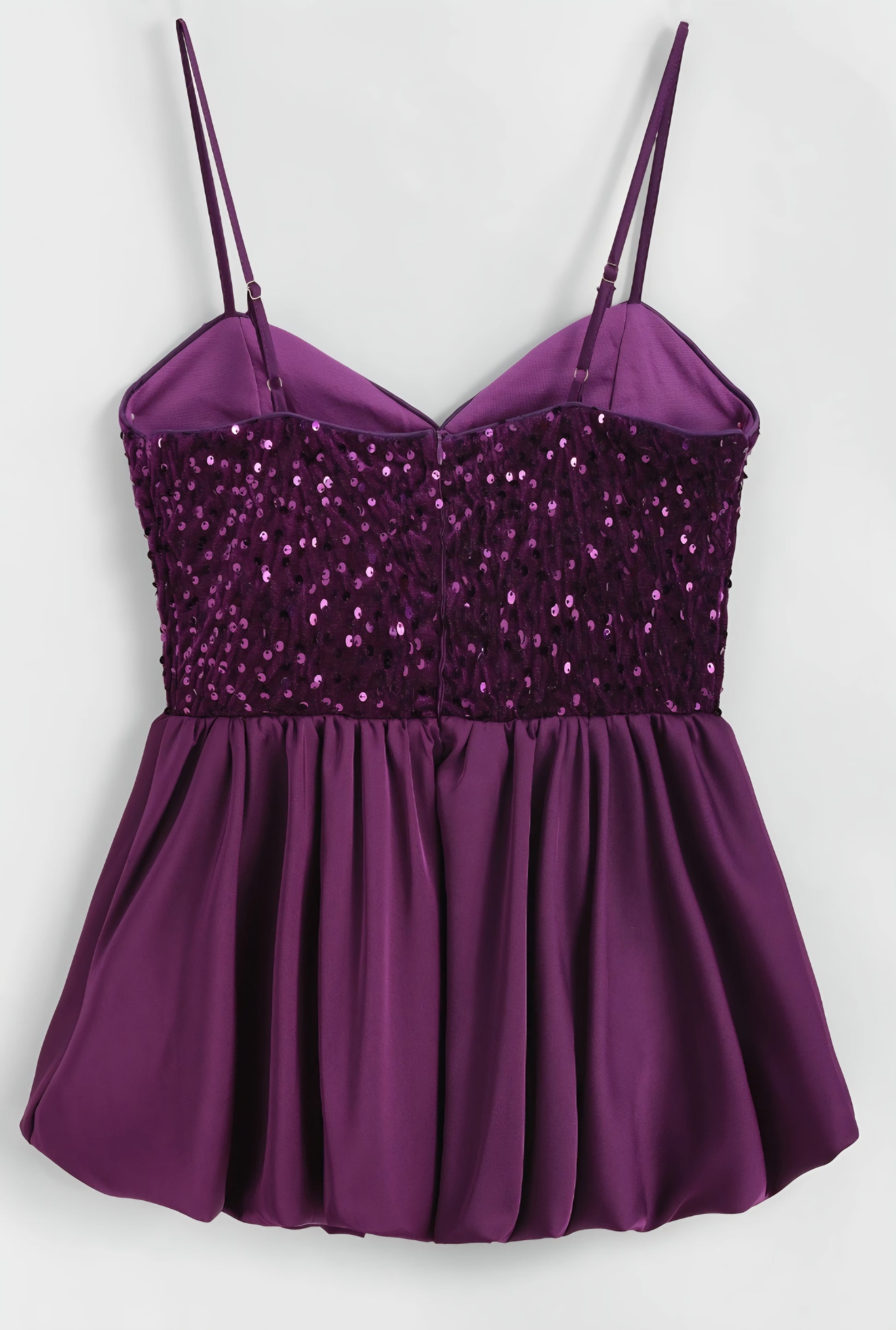 Justerbar topp med band. Sammetstopp klädd med paljetter. Hjärtformad halsringning med prinsesssnitt. Peplum i satinkant. Dold dragkedja bak.