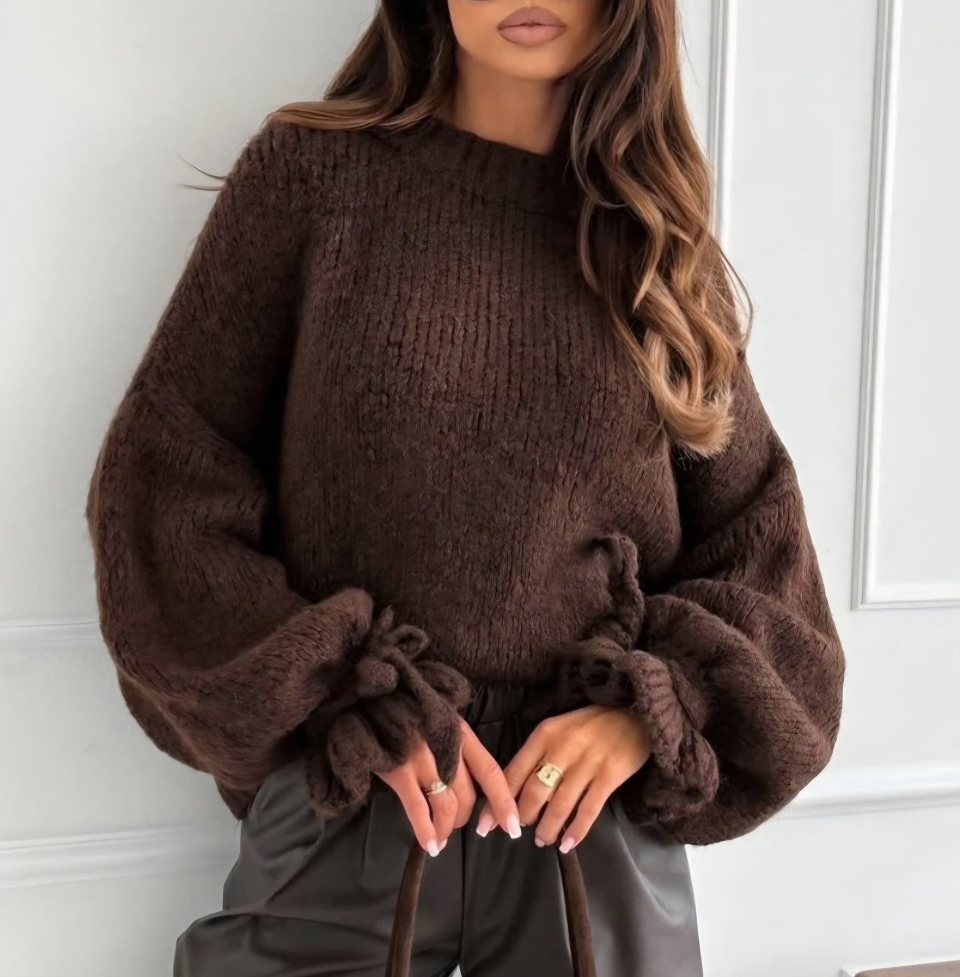 Förälska dig i mjukheten hos denna ull- och mohairtröja, perfekt för en mysig och trendig look. Dess överdimensionerade passform förstärks av långa puffärmar med fina knytband för en feminin och elegant touch. Den plyschiga stickningen garanterar värme och komfort under hela säsongen.