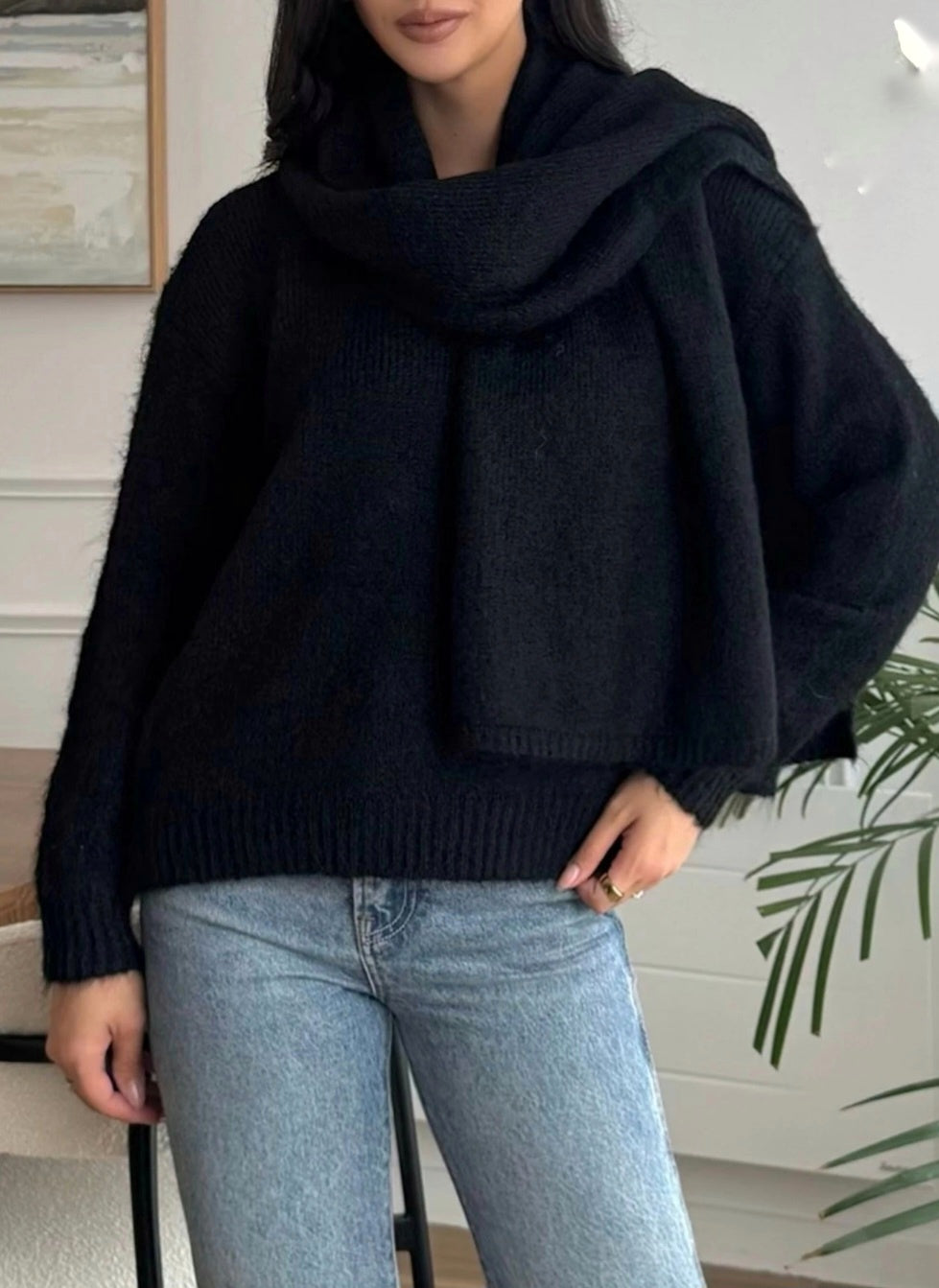 Mysigt och trendigt set: mjuk V-ringad tröja med avslappnad passform, kombinerad med matchande halsduk. Perfekt för en elegant och bekväm vardagslook.